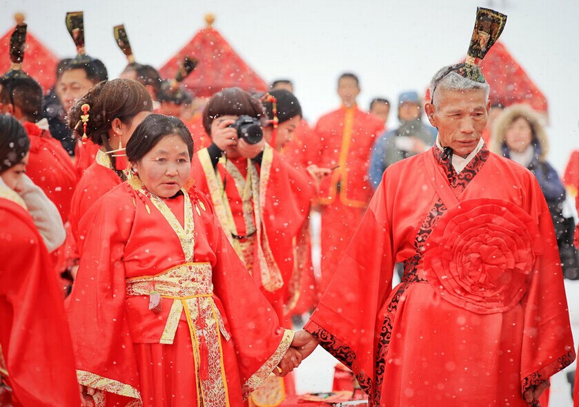 2014年12月27日,重庆武隆第六届仙女山冰雪童话节激情开幕,通过前期面向广大游客招募的99对新婚夫妻,在开幕式当天举行了盛大浪漫的汉式雪地集体婚礼,其中不乏外国友人及黄昏恋老人。图为参加婚礼的外国夫妇。